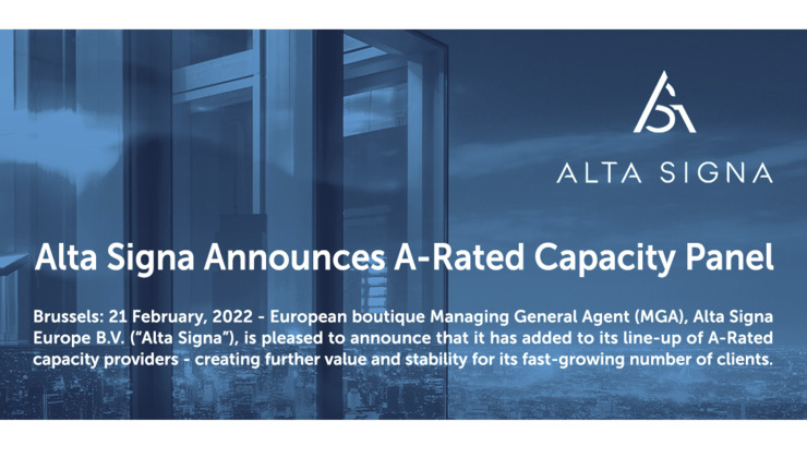 Brussels: 21 February, 2022 - European boutique Managing General Agent (MGA), Alta Signa Europe B.V. (“Alta Signa”), is pleased to announce that it has added to its line-up of A-Rated capacity providers - creating further value and stability for its fast-growing number of clients.